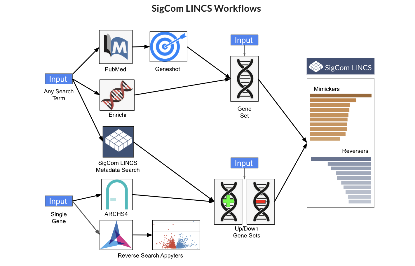 Query SigCom LINCS which is a web-based search engine that serves over 1.5 million gene expression signatures processed, analyzed, and visualized from LINCS, GTEx, and GEO. SigCom LINCS provides rapid signature similarity search for mimickers and reversers given sets of up and down genes.
